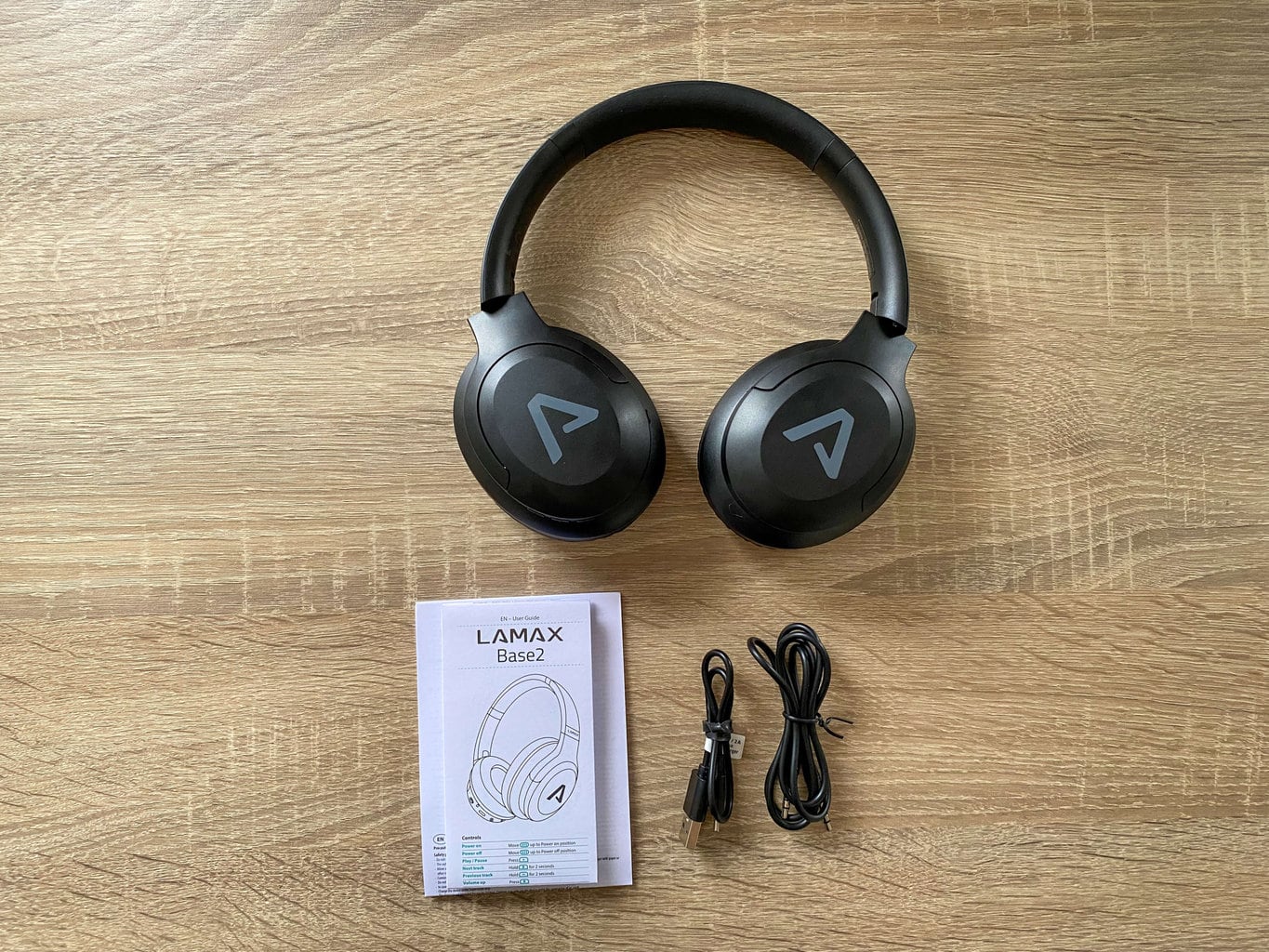 Der kabellose Kopfhörer LAMAX Base2 überrascht nicht allzu sehr mit dem Inhalt der Verpackung. Neben dem Kopfhörer selbst erhält man lediglich ein Stromkabel mit USB-C-Anschluss, ein Kabel mit 3,5-mm-Klinkenanschluss für das klassische kabelgebundene Hören und eine Bedienungsanleitung.