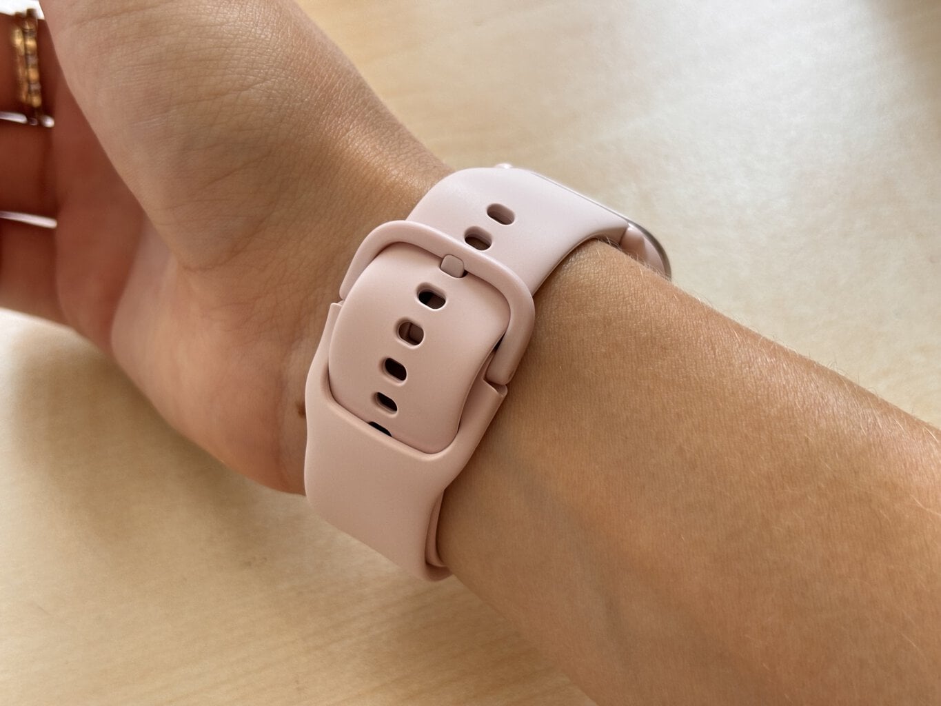 Die Amazfit Active hat mich sofort mit ihrem schlichten Aussehen überzeugt. Das Ende des Armbands gleitet geschickt in den inneren Teil des Umfangs, wodurch es schön aussieht und gleichzeitig nicht hängen bleibt. Das 20-Millimeter-Silikonarmband ist praktisch für Wasser und Sport, außerdem ist es vom Gehäuse der Uhr abnehmbar. Wenn man mehrere Armbänder kauft, kann man sie nach Bedarf austauschen, obwohl ich zugeben muss, dass ich mit meinen langen Nägeln das Band nicht sofort abnehmen konnte.