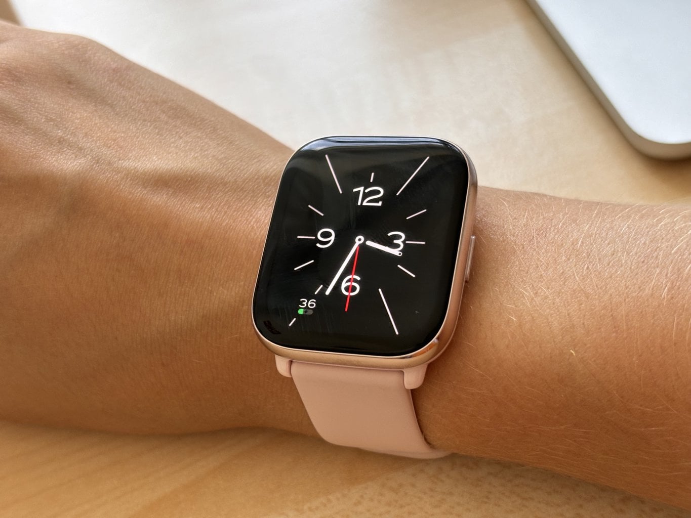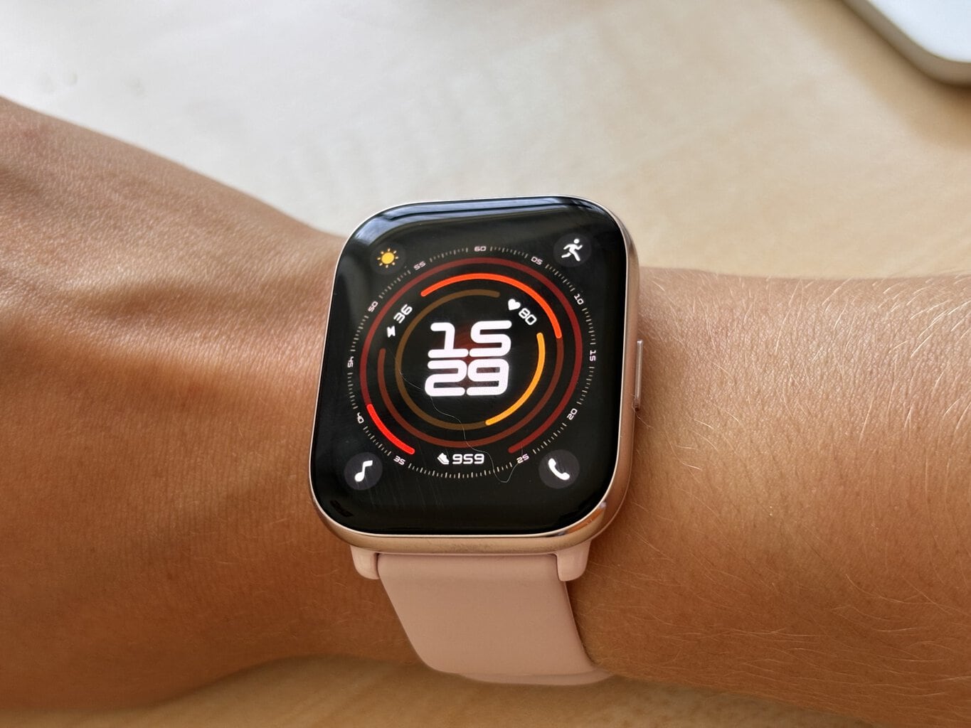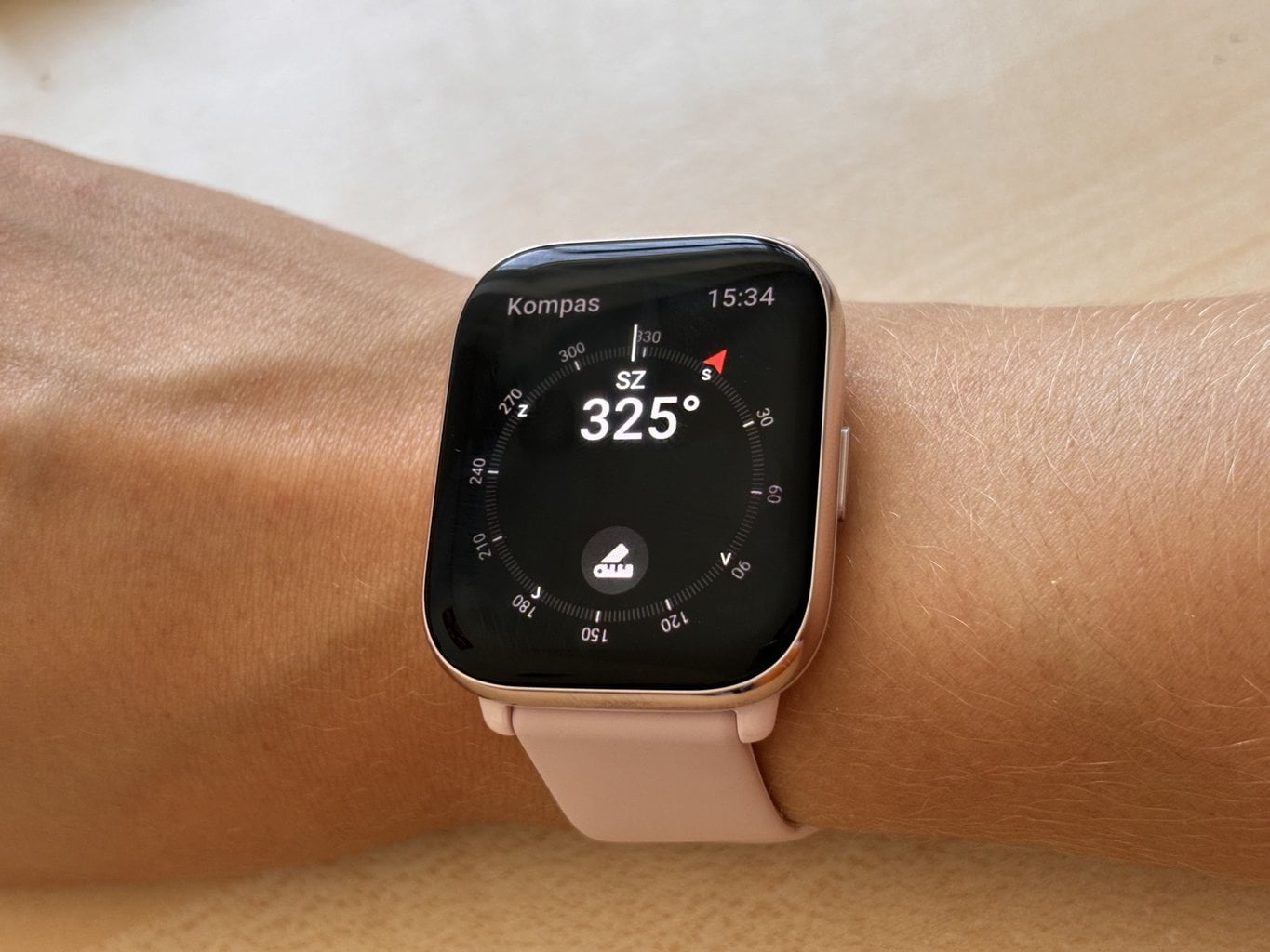 Die Smartwatch hat mich sofort mit ihrem großen AMOLED-Display und gleichzeitig ihrem geringen Gewicht beeindruckt. Die schönen 24 g sind eher eine Seltenheit im Bereich der Smartwatches und man wird es sicherlich zu schätzen wissen, wenn man sie ständig trägt. Leichter sind zum Beispiel die Amazfit GTS 4 mini, aber mit einem viel kleineren Display und ohne Telefonfunktion.