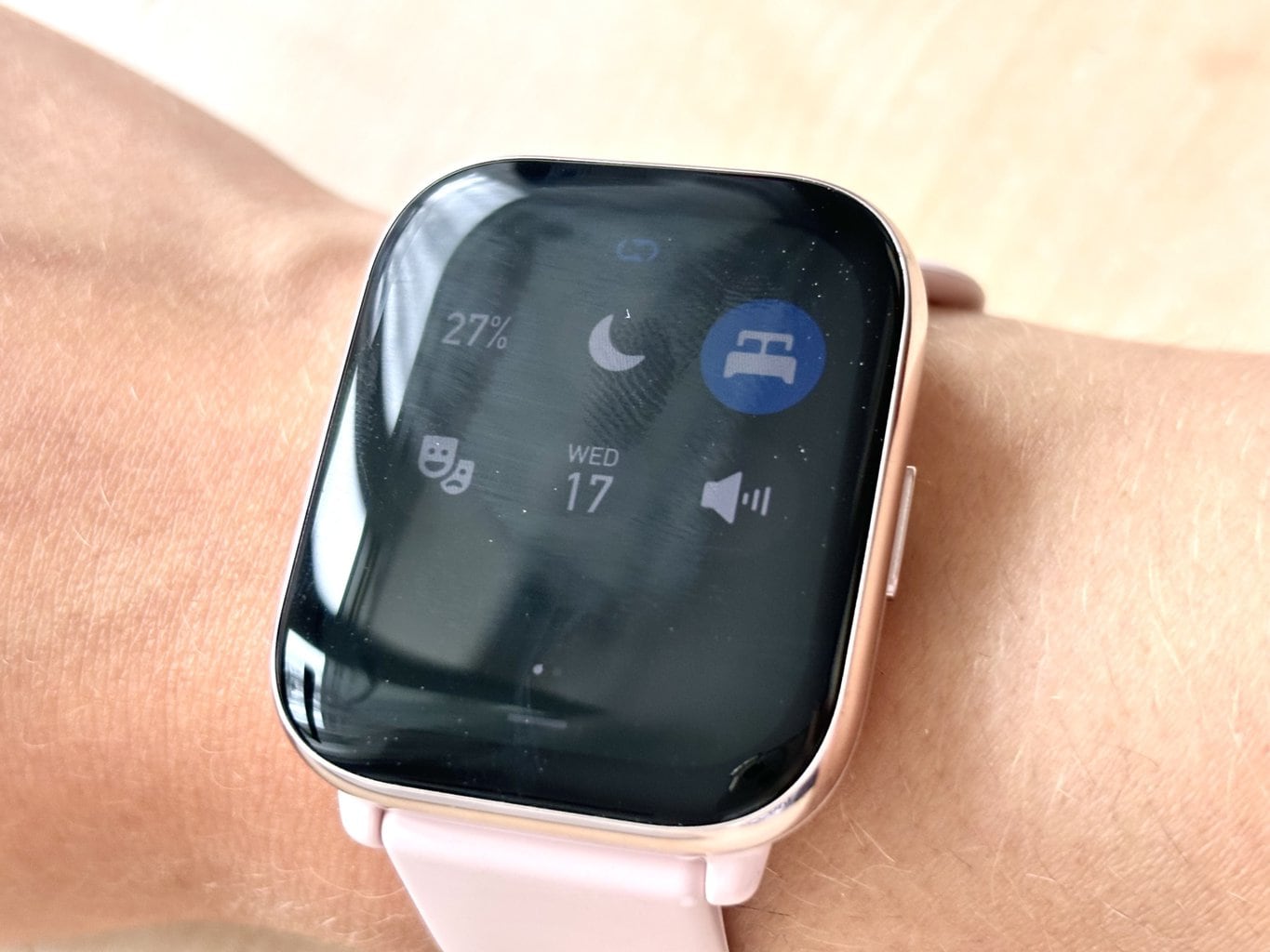 Dank ihres geringen Gewichts sollte die Smartwatch Sie nachts nicht beschweren, meiner Erfahrung nach hat sie nicht einmal gestört. Vergessen Sie nicht, vor dem Schlafengehen das Bettsymbol zu wählen (nicht den Modus "Nicht stören" mit dem Mondsymbol, wie ich annahm), bei dem die Helligkeit der Uhr gedimmt wird und die Uhr bei Bewegung nicht aufleuchtet.