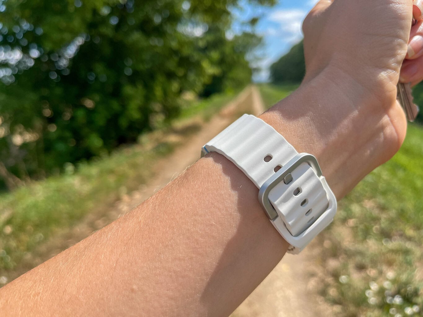 Das Armband besteht aus Silikon und ist daher sehr angenehm am Handgelenk zu tragen. Das Design hat eine gewisse generationenübergreifende Neuerung erfahren, denn es ist nicht mehr rein glatt, sondern leicht gewellt. Mir persönlich gefällt diese Veränderung und ich mag das Aussehen, aber das ist natürlich eine sehr subjektive Angelegenheit. Dann sehe ich eine praktische Funktion darin, dass das Band nicht rundherum mit der Haut verklebt ist und die Haut darunter beim Sport nicht so stark schwitzt.